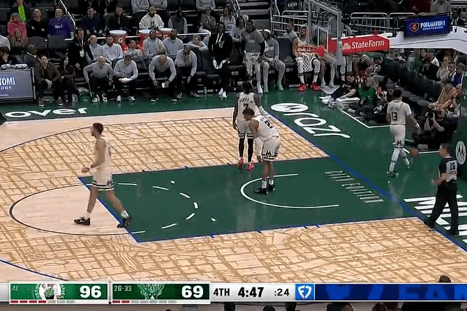 比赛的第四节,普里查德三分投进,绿军领先雄鹿到30分分差杀死比赛悬念。