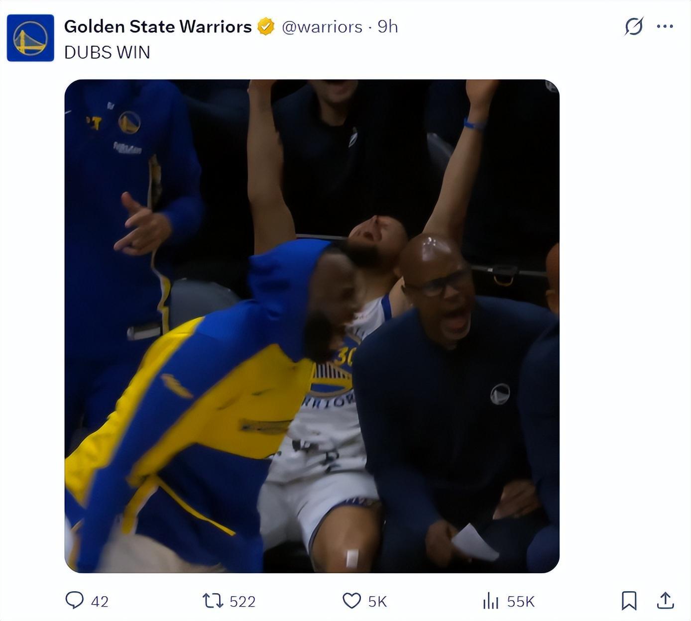 库里末节仅登场5分钟,4中2+三分2中1+罚球4中4拿到9分后就被科尔换下休息,因为两队的分差过大,库里也在场下疯狂的为队友呐喊打Call,当队友命中三分球时他再一次双手举天庆祝,本赛季有太多的比赛是依靠科尔的12人轮换拿下,库里的登场时间并不多。